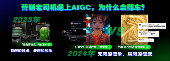 2023年麦当劳(中国)通过AIGC文生图时刻,将其居品和中国传统文化进行数字创意生成,获取了行业和消耗者的一致称赞。而2024年,生成式AI时刻干预音视频时期,麦当劳(日本)使用AIGC新时刻生成的“好意思女+薯条”AI创意视频,反而引发日本网友的大边界“吐槽”。是以回到阿谁问题,AI时刻更好了,创意也给到了,但为什么用户却并莫得很好的感受,AI应该背这个锅吗?