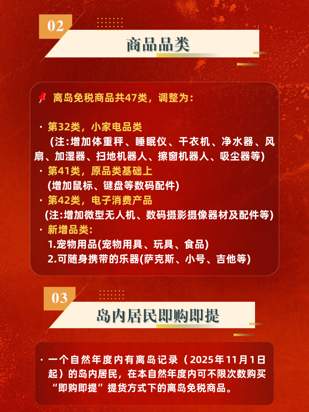对游客而言,和此前的免税购物政策比较,封关后的免税商品品类从45大类商品加多至47大类,新增大类为宠物用品(宠物用具、玩物、食物)和可随身捎带的乐器(萨克斯、小号、吉他等)。此外,在此前的大类中新增了体重秤、干衣机、扫地机器东谈主、小型无东谈主机、数码照相录像器材及配件等商品。